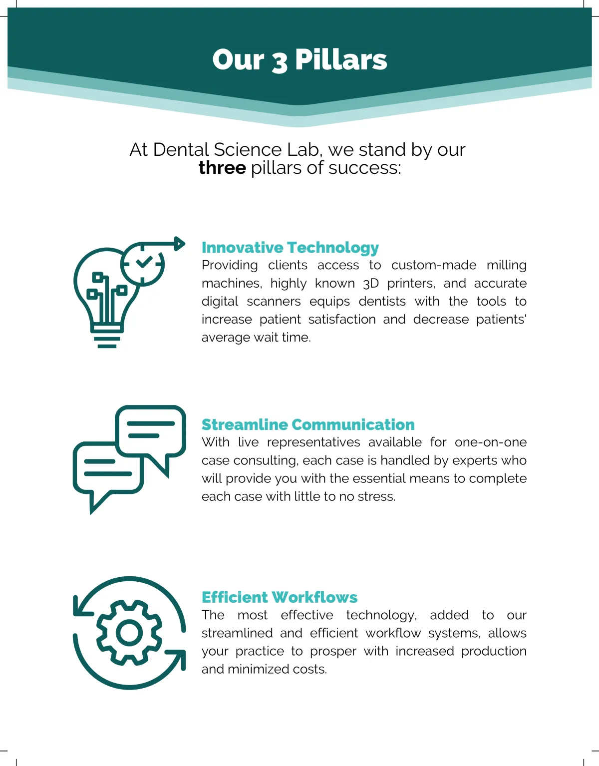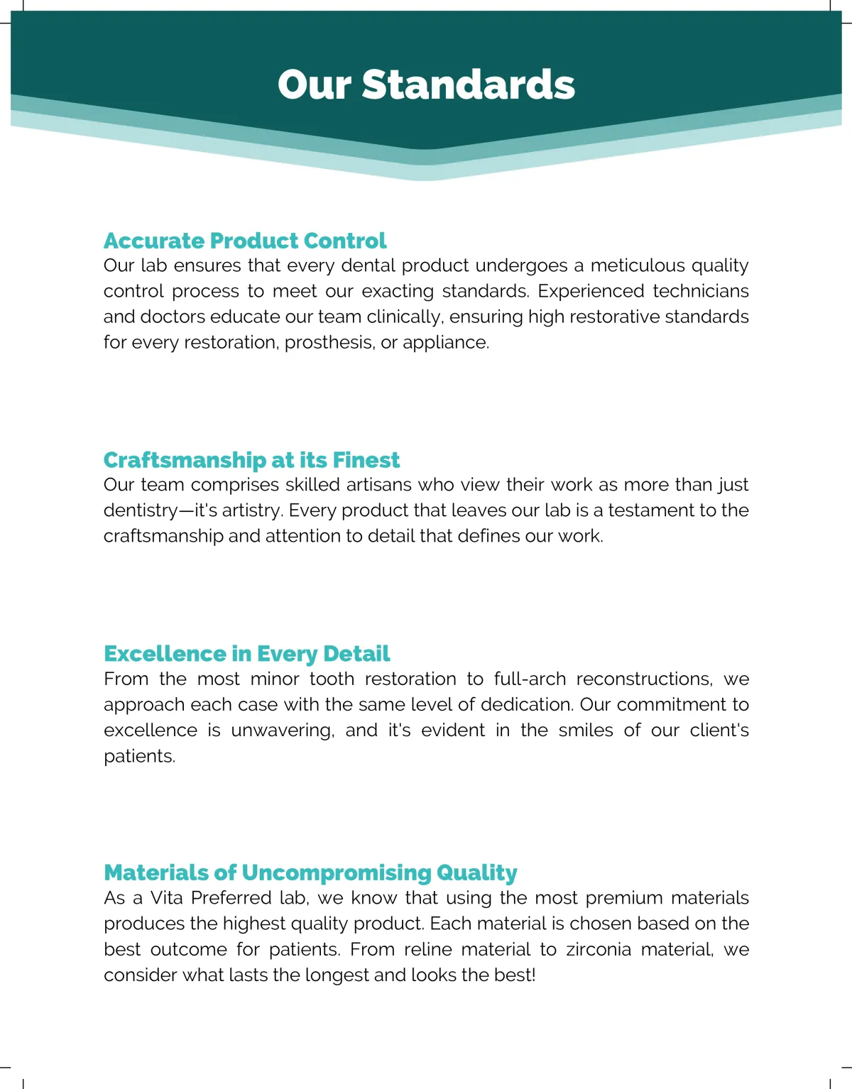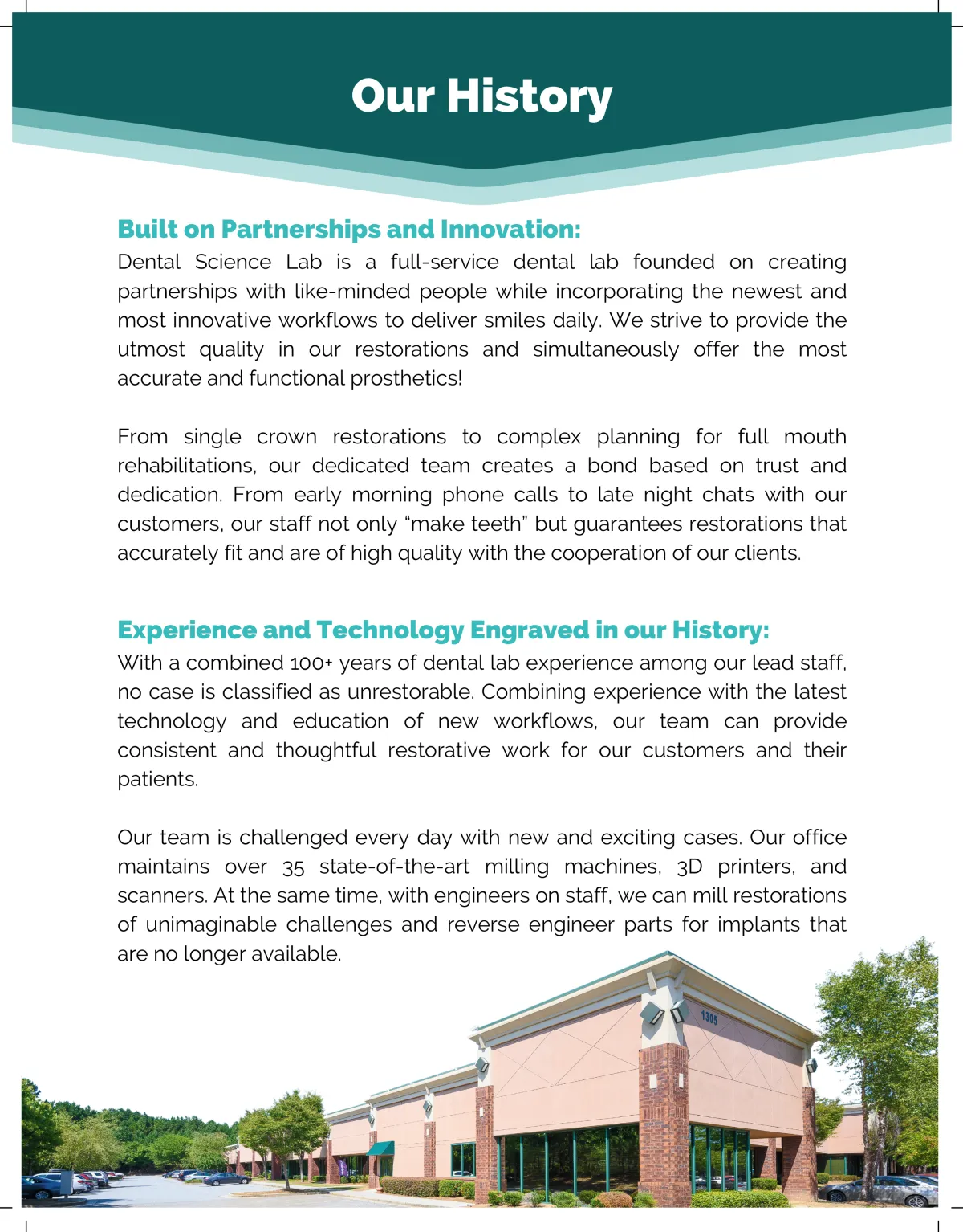 With our experience in the field, 35+ years on average for technicians on our team, and our dedication to innovation and technological advancements, we are able to fuse the art of dentistry and the science behind new technology to minimize workflow time while not sacrificing aesthetics. We have also worked with the largest in the game, such as Clear Choice Dental Implant Center and Aspen as their preferred lab for 12+ years making us even more aware of some of the most challenging cases that clinicians can face. While being completely full-service and willing to take phone calls at anytime of day, we strive to make sure patients receive the right treatment and not just any treatment.