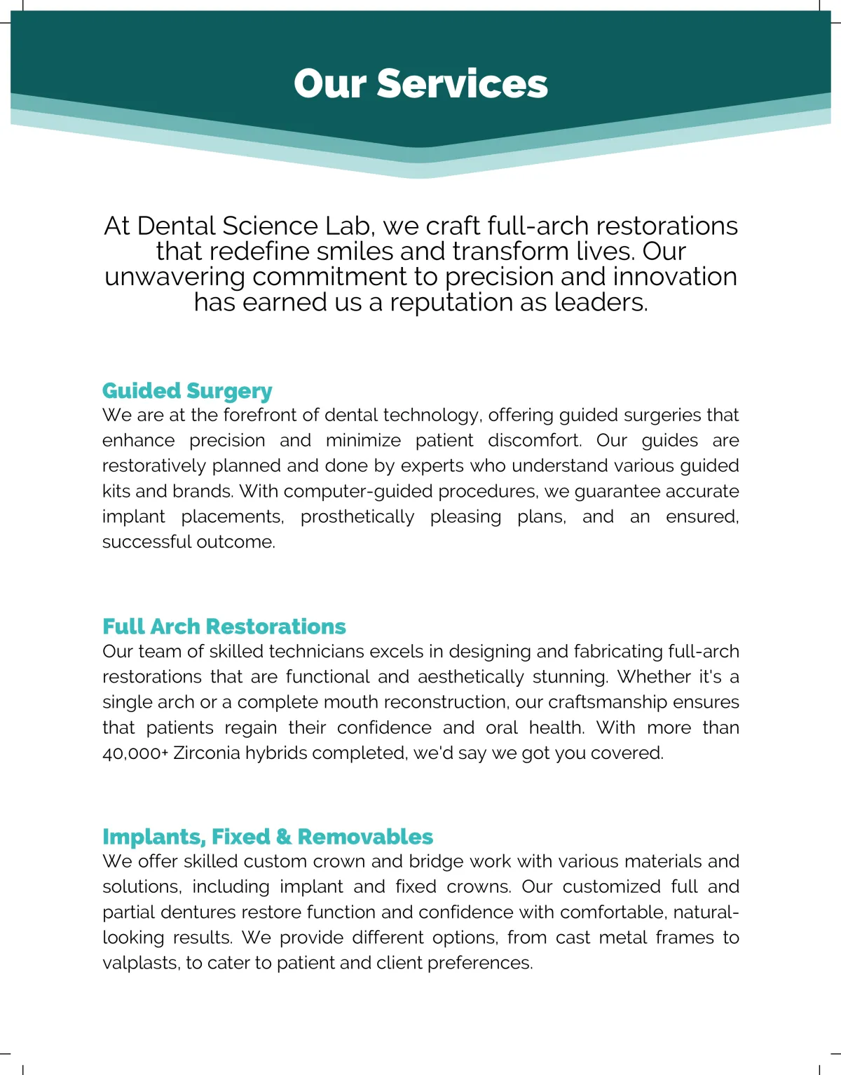 At Dental Science Lab, we craft full-arch restorations that redefine smiles and transform lives. Our unwavering commitment to precision and innovation has earned us a reputation as leaders. With our advanced digital workflows, we help guide our doctors to plan and complete full arch cases within 3-4 visits without sacrificing fit, function, or aesthetics. With more than 40,000+ zirconia hybrids completed, we'd say there isn't a type of case we cannot restore.