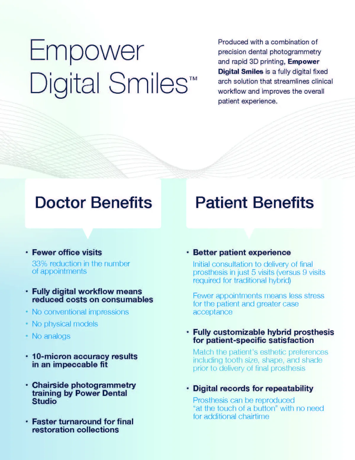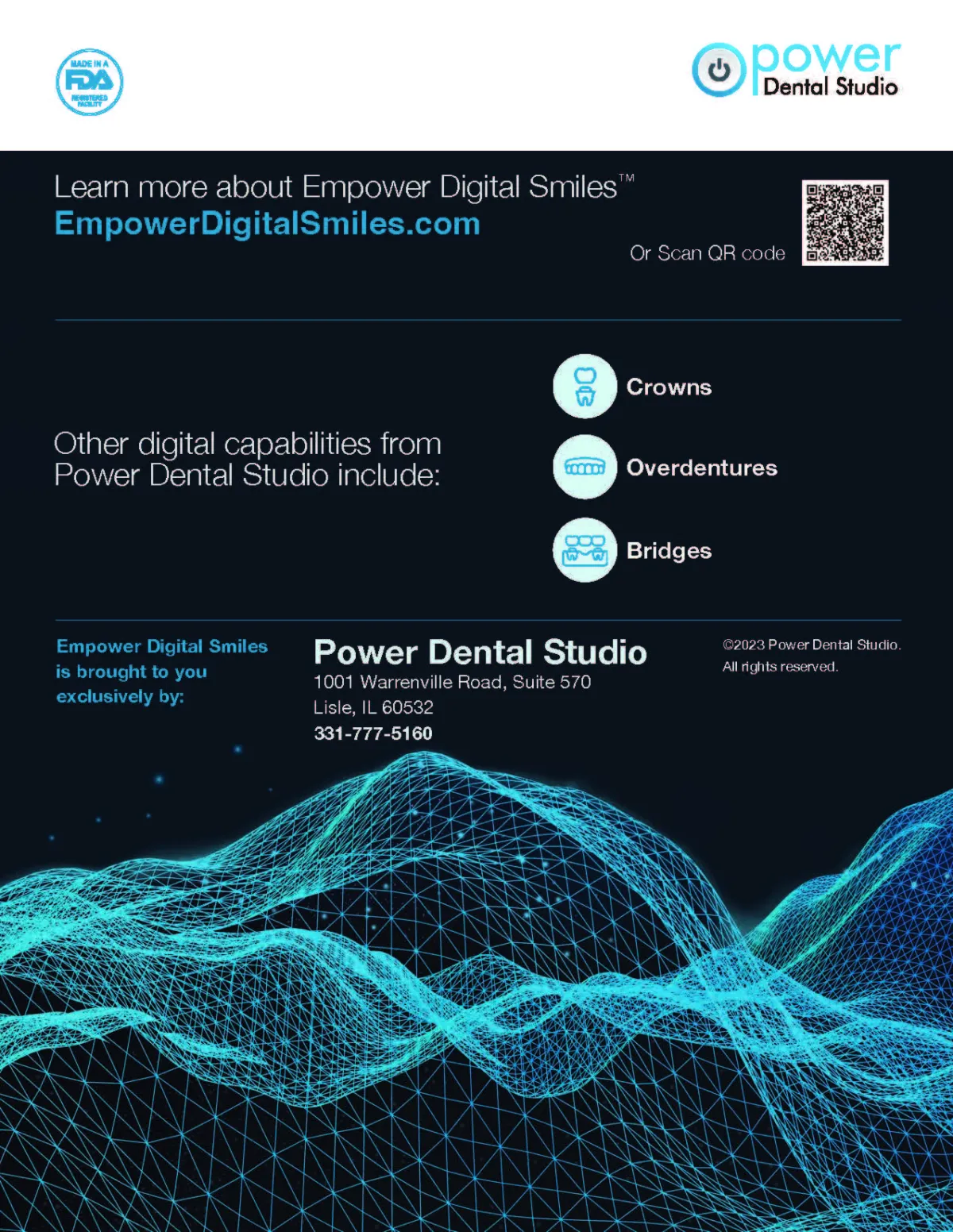 Power Dental Studio is a full-service dental laboratory located in Lisle, IL. Our lab specializes in the full arch digital workflow inclusive of photogrammetry and grammetry design from stage 0-2 and the fabrication of temporary and final full arch restorations. We take pride in our high-quality work and fast turnaround times helping doctors increase chair time efficiencies, have better patient experiences and improving overall clinical outcomes.